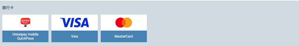 銀行卡:Visa、MasterCard、Unionpay mobile QuickPass