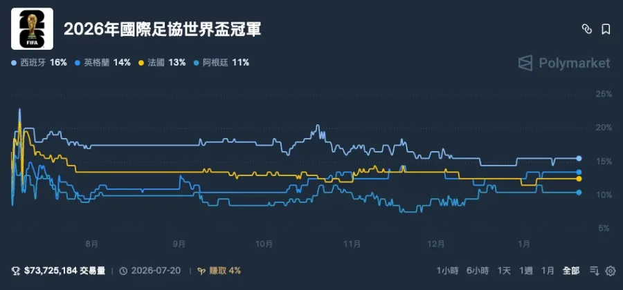 每屆世界盃足球,像英國、法國、巴西、阿根廷等傳統足球強國,幾乎都位於冠軍賠率榜前段。然而,越熱門的隊伍,其賠率越容易被市場壓低,實際報酬空間反而有限。(資料來源:Polymarket 2026國際足協世界盃冠軍)